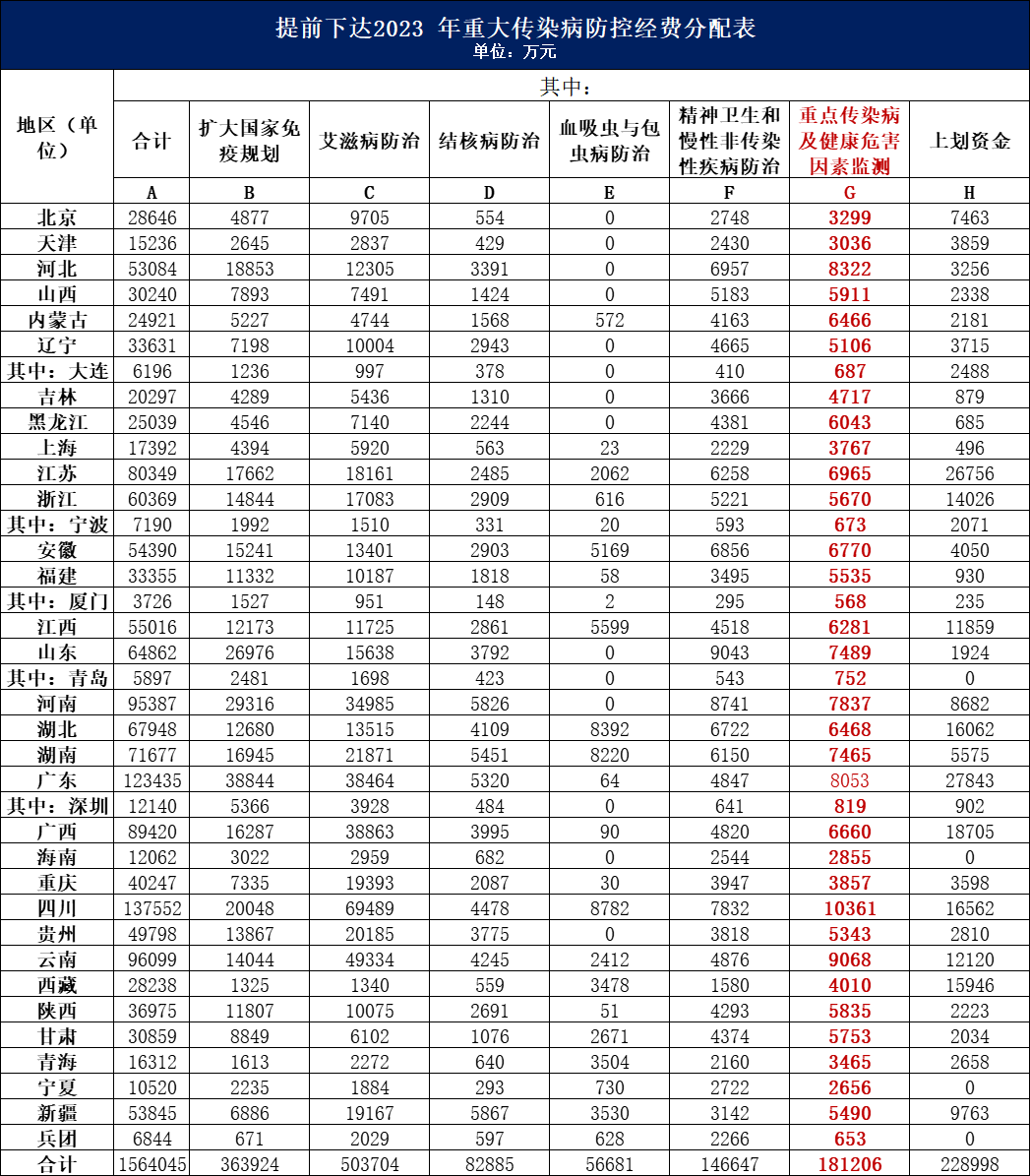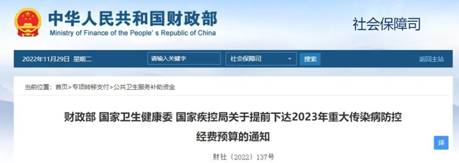 日前,國家財政部、國家衛生健康委、國家疾控局三部門聯合發布了《財政部 國家衛生健康委 國家疾控局關于提前下達2023年重大傳染病防控經費預算的通知》。此次提前下達的2023年重大傳染病防控經費共計156.4億元,相較于2022增長31%。